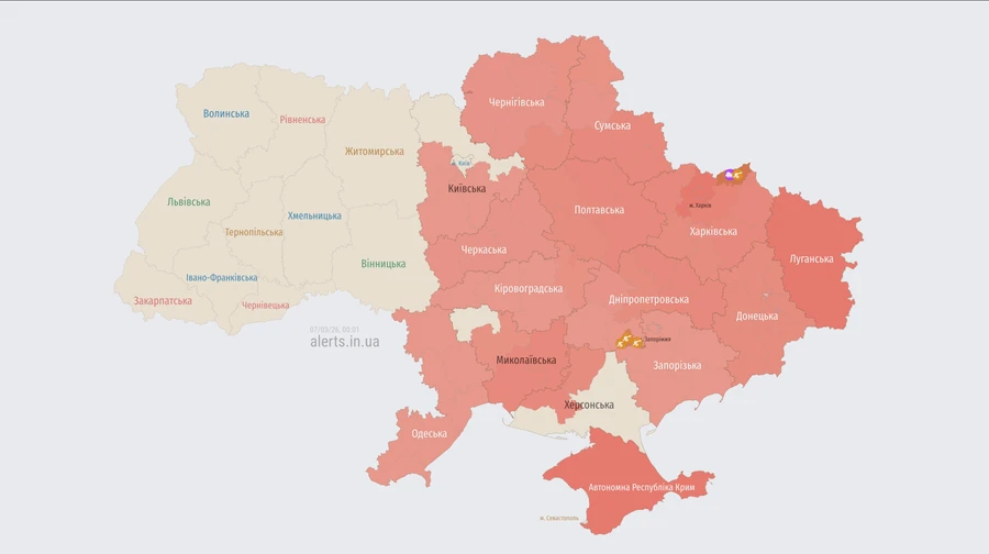 У ніч на суботу, 7 березня, у низці областей України оголошено повітряну тривогу через застосування ворогом ударних безпілотників.