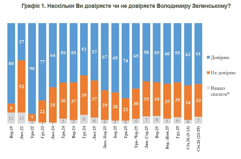 “Наразі більшість українців – 61% – продовжують довіряти президенту, не довіряють – 33%. Баланс довіри-недовіри становить +28%. У середині січня 2026 року показники були майже ідентичні”, – зазначили соціологи.