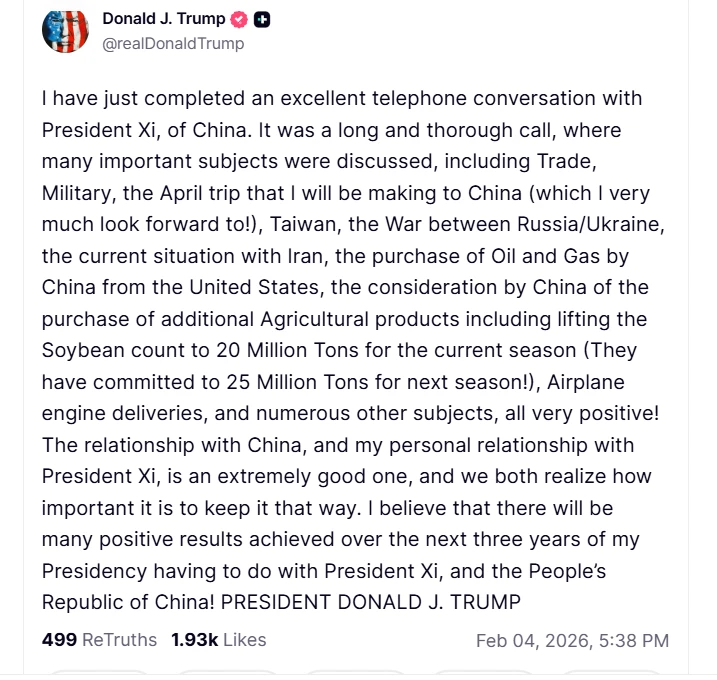 Лідер КНР Сі Цзіньпін 4 лютого провів телефонну розмову з президентом США Дональдом Трампом.