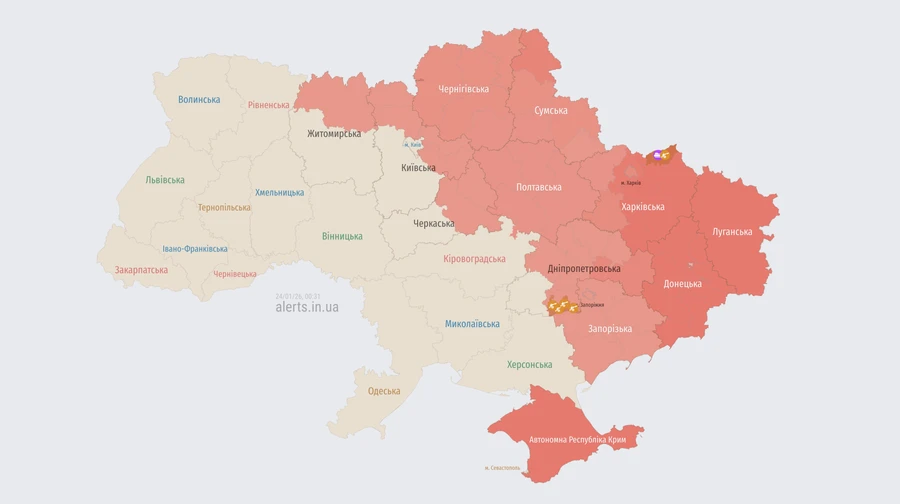 У ніч на 24 січня російські війська здійснюють чергову масовану атаку ударними безпілотниками на територію України. Ворожий дрон влучив у один з районів Харкова, у низці областей оголошено повітряну тривогу.